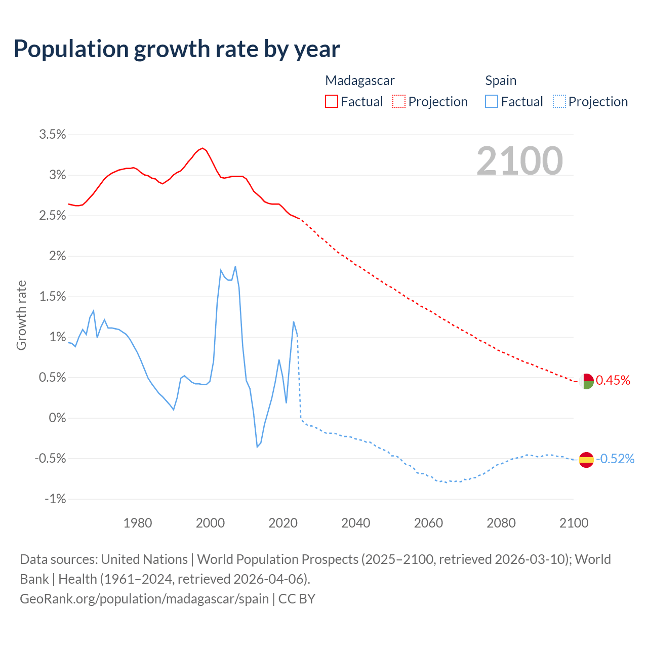 - For the last 10 years, Madagascar has had an average growth rate of +2.6% per year vs +0.43% in Spain.