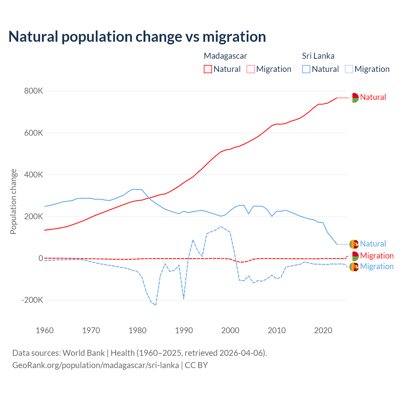 Over the last 10 years, 99.7% of the population change in Madagascar is from natural causes (a gain of 7,165,578 people) and 0.31% is from migration (a loss of 22,384 people). In Sri Lanka 85.3% is from natural causes (a gain of 1,605,749 people) and 14.7% is from migration (a loss of 276,121 people).