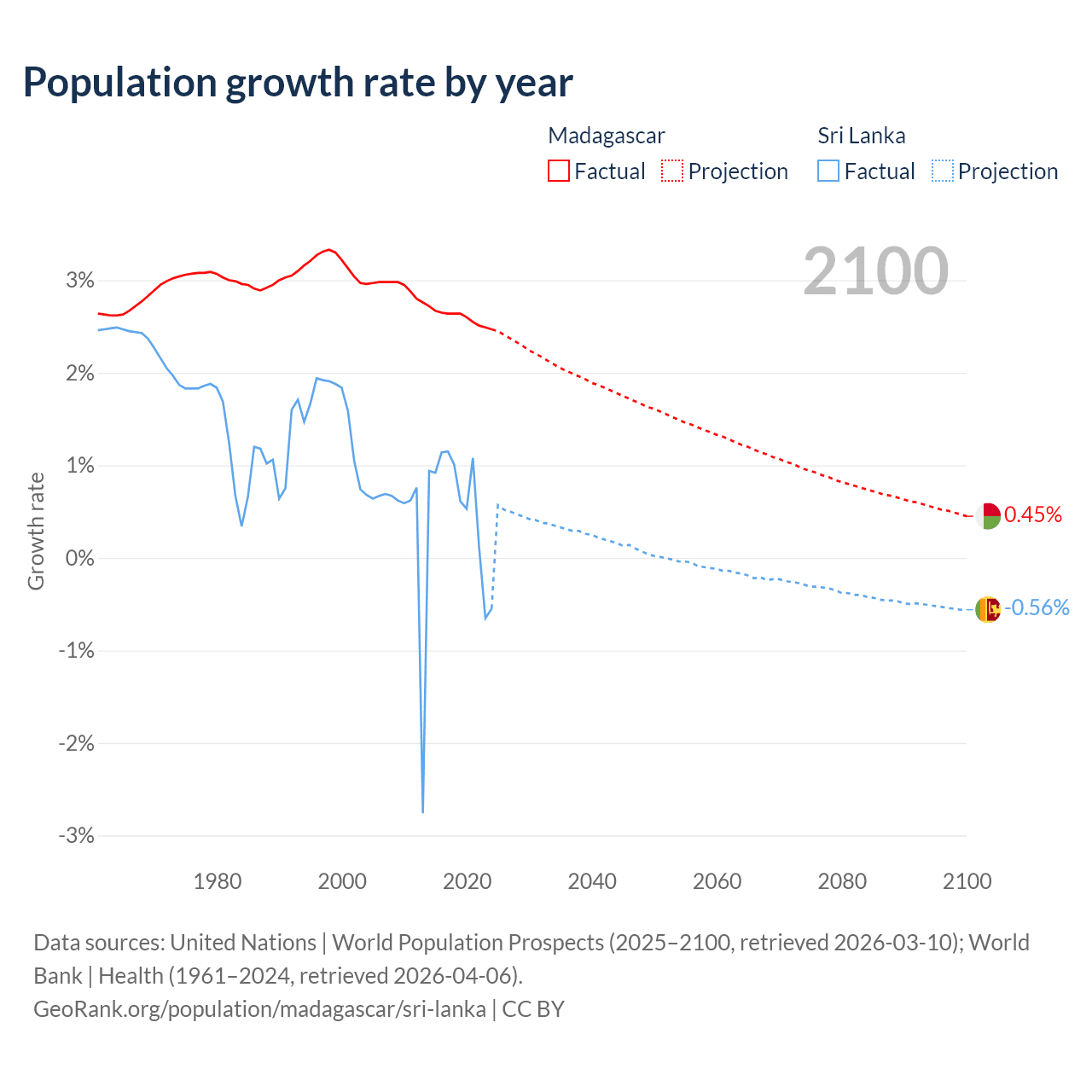 - For the last 10 years, Madagascar has had an average growth rate of +2.6% per year vs +0.57% in Sri Lanka.