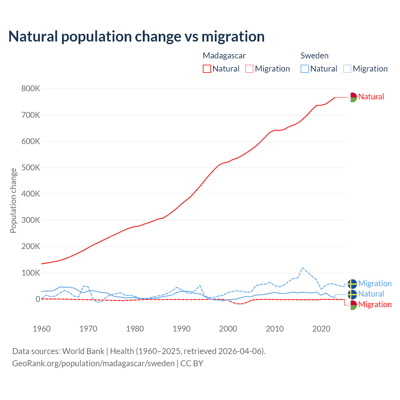 Over the last 10 years, 99.7% of the population change in Madagascar is from natural causes (a gain of 7,165,578 people) and 0.31% is from migration (a loss of 22,384 people). In Sweden 21.4% is from natural causes (a gain of 201,900 people) and 78.6% is from migration (a gain of 743,642 people).