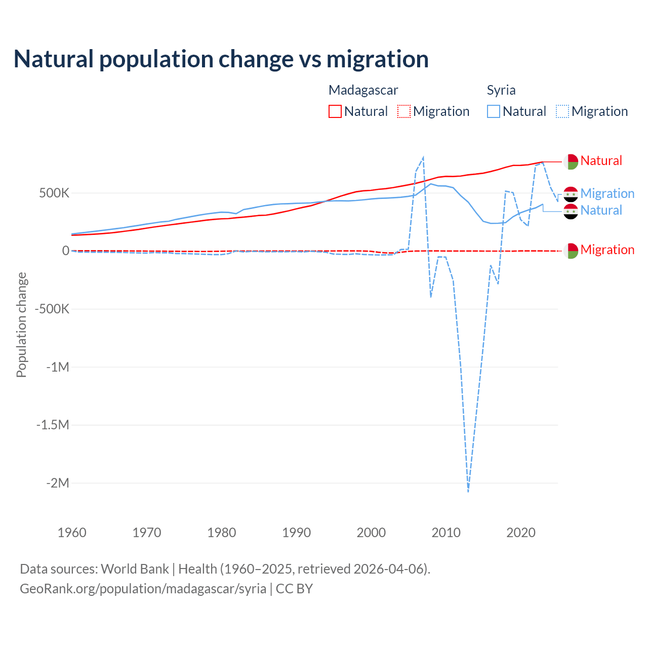 Over the last 10 years, 99.7% of the population change in Madagascar is from natural causes (a gain of 7,165,578 people) and 0.31% is from migration (a loss of 22,384 people). In Syria 91.3% is from natural causes (a gain of 3,047,621 people) and 8.72% is from migration (a gain of 291,069 people).