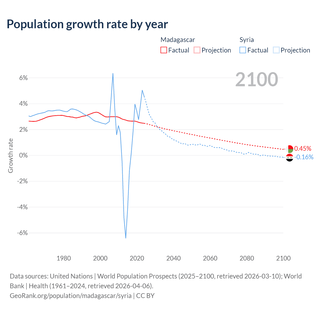 - For the last 10 years, Madagascar has had an average growth rate of +2.6% per year vs +1.25% in Syria.