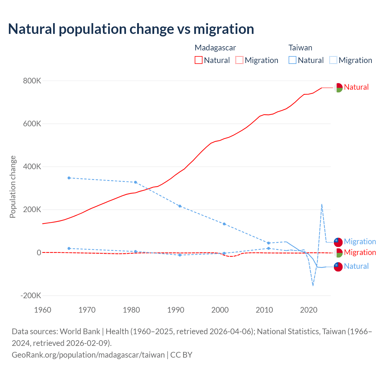 Over the last 10 years, 99.7% of the population change in Madagascar is from natural causes (a gain of 7,165,578 people) and 0.31% is from migration (a loss of 22,384 people). In Taiwan 56.7% is from natural causes (a loss of 57,467 people) and 43.3% is from migration (a gain of 43,884 people).