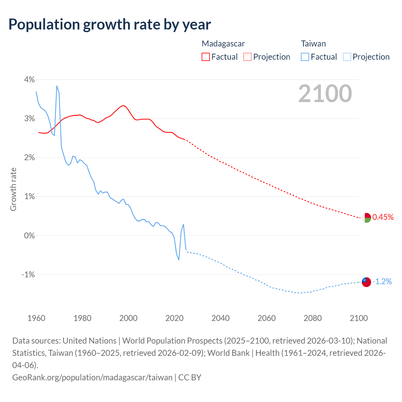- For the last 10 years, Madagascar has had an average growth rate of +2.6% per year vs -0.03% in Taiwan.