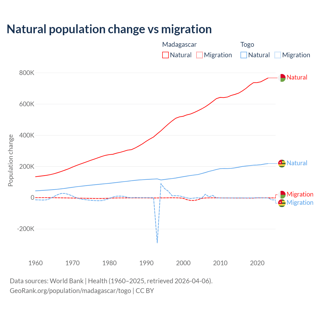 Over the last 10 years, 99.7% of the population change in Madagascar is from natural causes (a gain of 7,165,578 people) and 0.31% is from migration (a loss of 22,384 people). In Togo 99.1% is from natural causes (a gain of 2,052,115 people) and 0.86% is from migration (a loss of 17,852 people).