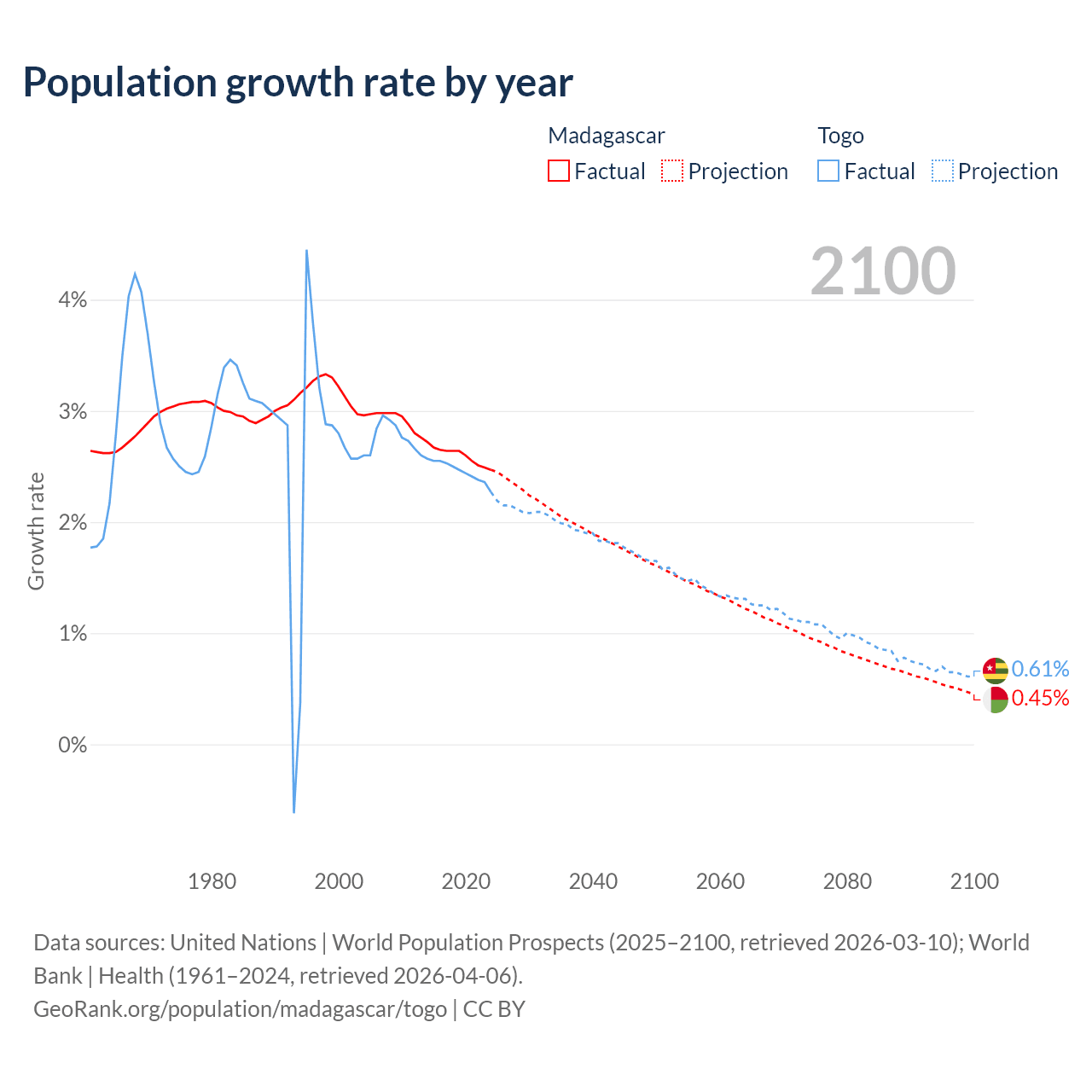 - For the last 10 years, Madagascar has had an average growth rate of +2.6% per year vs +2.46% in Togo.