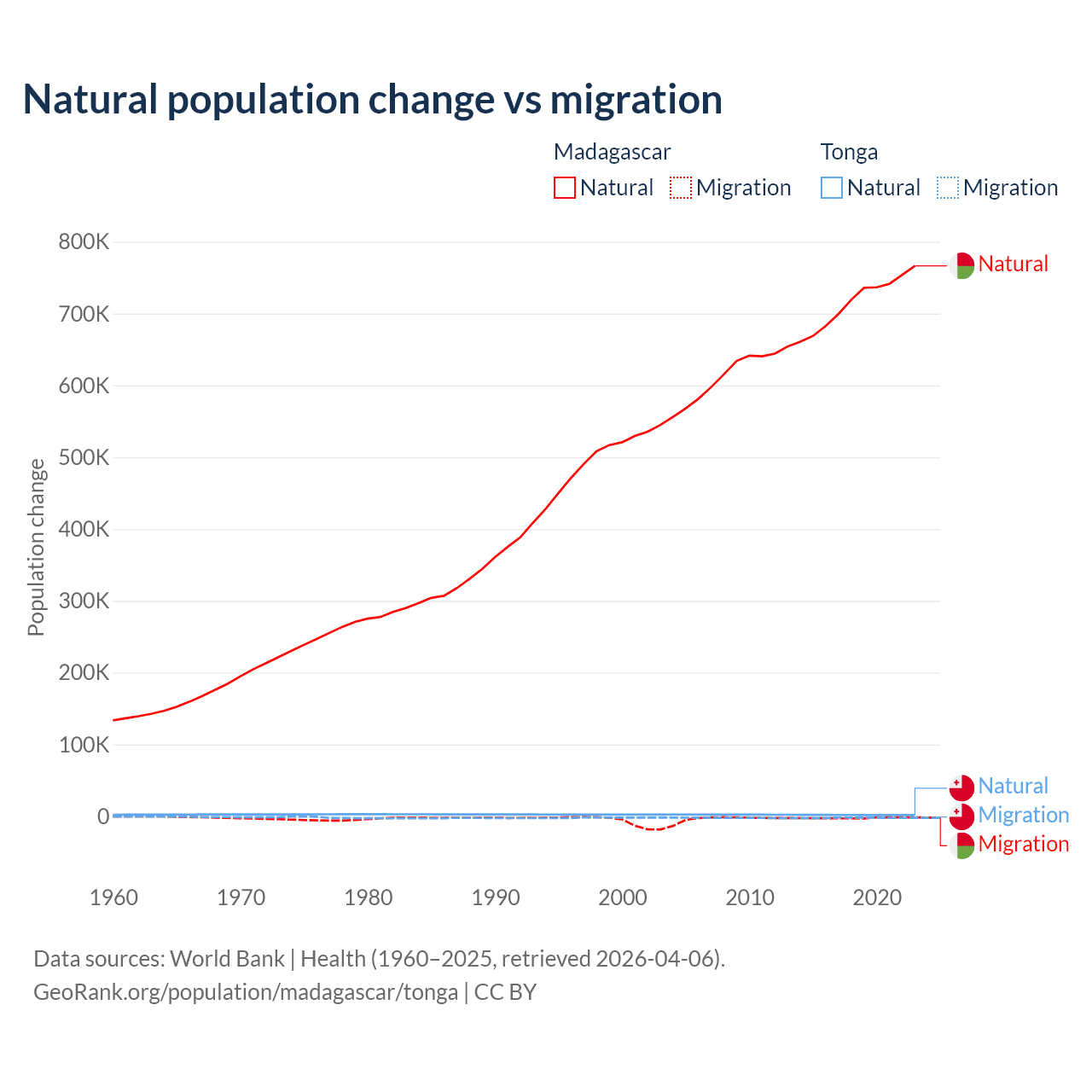 Over the last 10 years, 99.7% of the population change in Madagascar is from natural causes (a gain of 7,165,578 people) and 0.31% is from migration (a loss of 22,384 people). In Tonga 46.9% is from natural causes (a gain of 18,919 people) and 53.1% is from migration (a loss of 21,384 people).