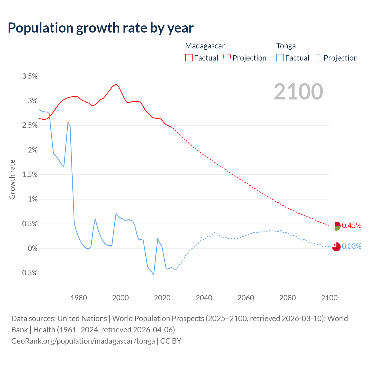- For the last 10 years, Madagascar has had an average growth rate of +2.6% per year vs -0.25% in Tonga.
