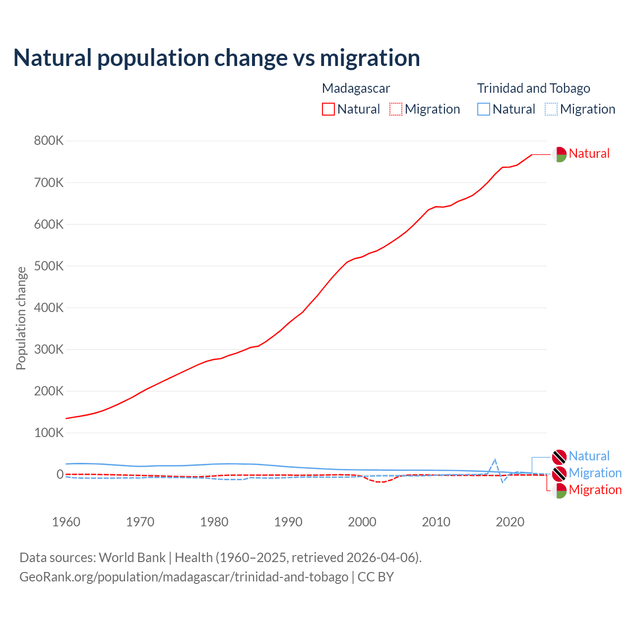 Over the last 10 years, 99.7% of the population change in Madagascar is from natural causes (a gain of 7,165,578 people) and 0.31% is from migration (a loss of 22,384 people). In Trinidad and Tobago 66% is from natural causes (a gain of 55,887 people) and 34% is from migration (a gain of 28,785 people).