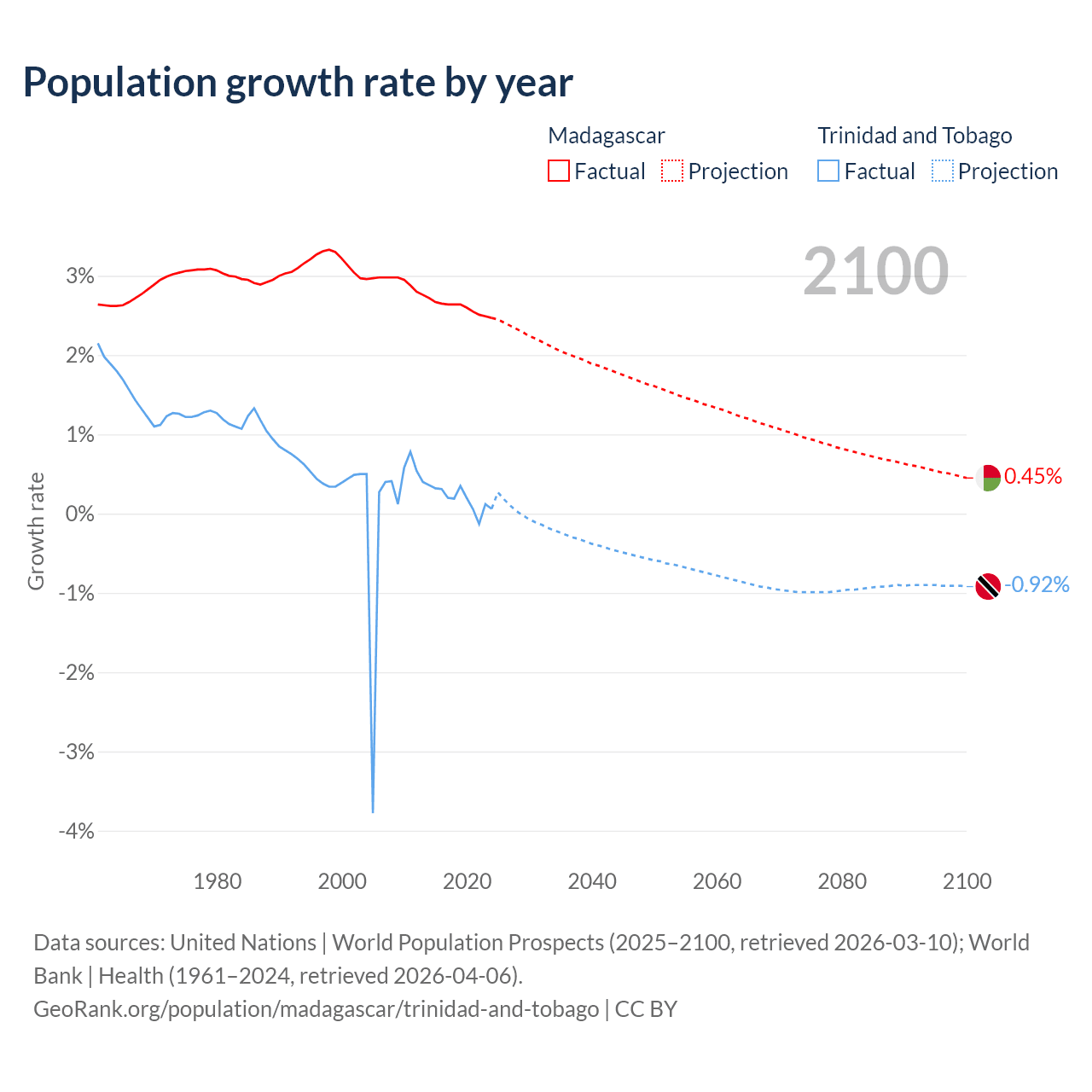 - For the last 10 years, Madagascar has had an average growth rate of +2.6% per year vs +0.19% in Trinidad and Tobago.