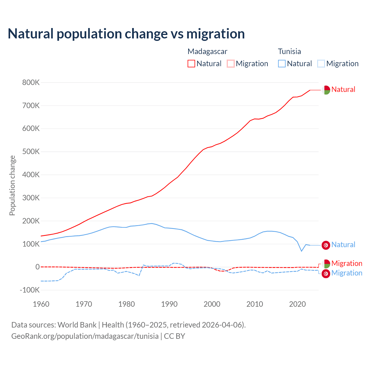 Over the last 10 years, 99.7% of the population change in Madagascar is from natural causes (a gain of 7,165,578 people) and 0.31% is from migration (a loss of 22,384 people). In Tunisia 86.3% is from natural causes (a gain of 1,225,079 people) and 13.7% is from migration (a loss of 195,011 people).