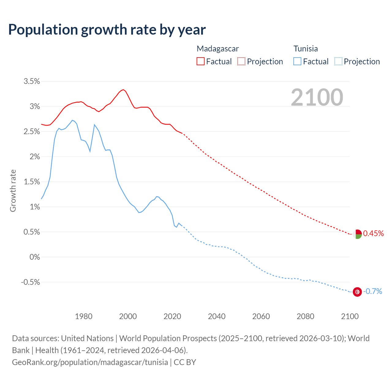 - For the last 10 years, Madagascar has had an average growth rate of +2.6% per year vs +0.89% in Tunisia.