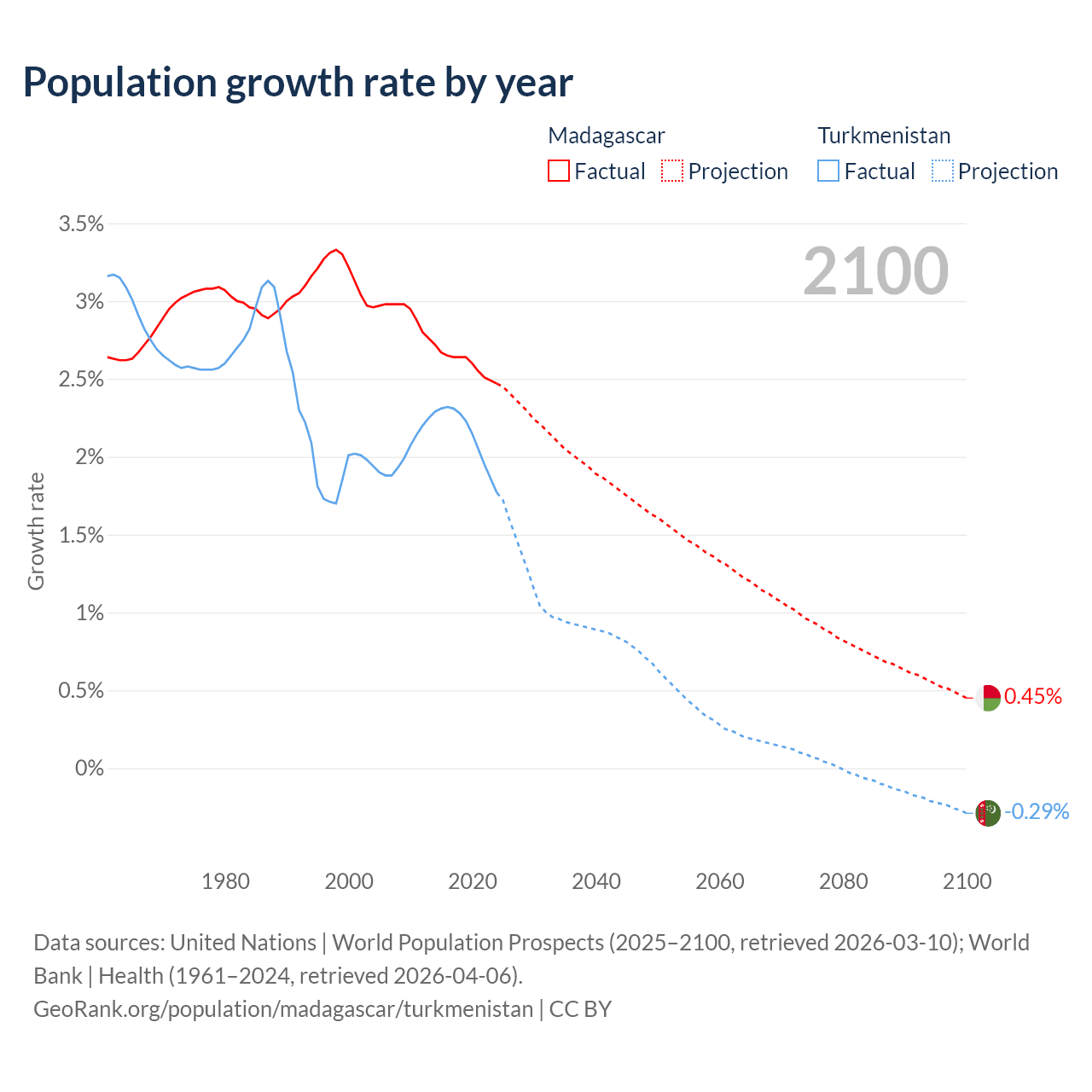 - For the last 10 years, Madagascar has had an average growth rate of +2.6% per year vs +2.14% in Turkmenistan.