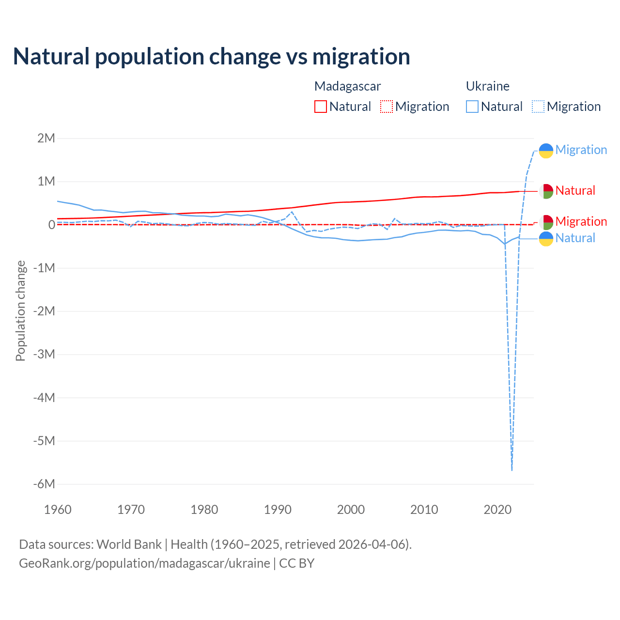 Over the last 10 years, 99.7% of the population change in Madagascar is from natural causes (a gain of 7,165,578 people) and 0.31% is from migration (a loss of 22,384 people). In Ukraine 28.2% is from natural causes (a loss of 2,435,153 people) and 71.8% is from migration (a loss of 6,198,995 people).