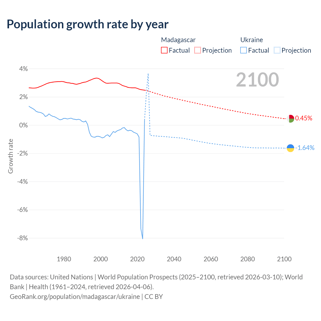 - For the last 10 years, Madagascar has had an average growth rate of +2.6% per year vs -1.74% in Ukraine.