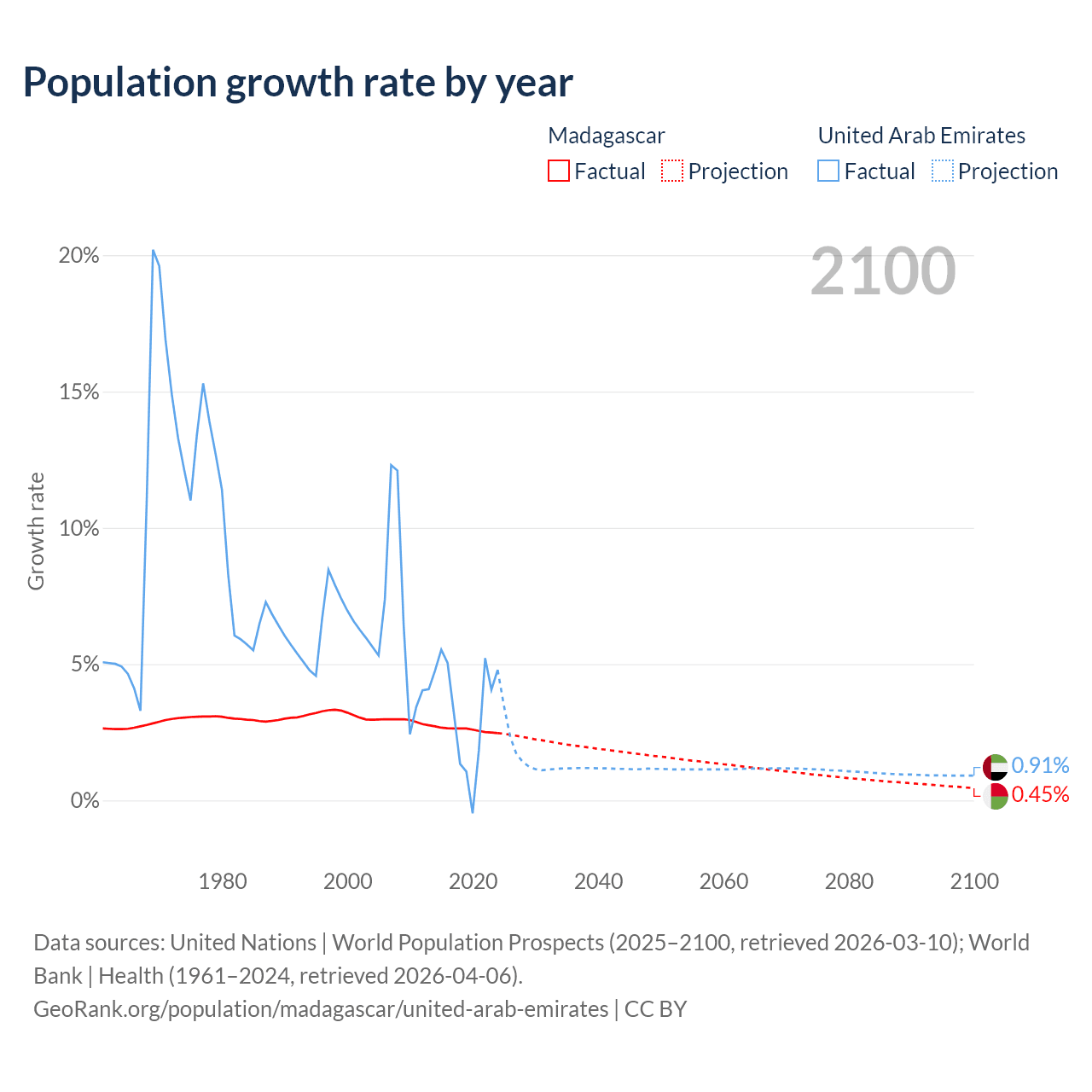 - For the last 10 years, Madagascar has had an average growth rate of +2.6% per year vs +3.31% in the United Arab Emirates.