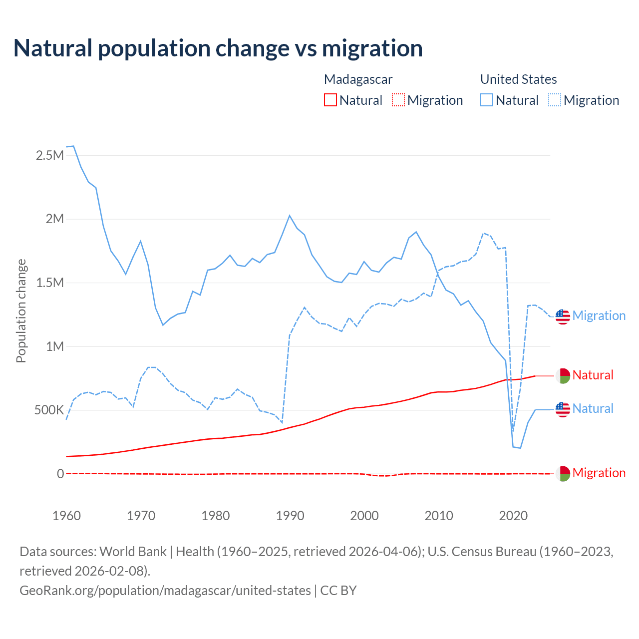 Over the last 10 years, 99.7% of the population change in Madagascar is from natural causes (a gain of 7,165,578 people) and 0.31% is from migration (a loss of 22,384 people). In the United States 35.8% is from natural causes (a gain of 8,005,866 people) and 64.2% is from migration (a gain of 14,334,286 people).