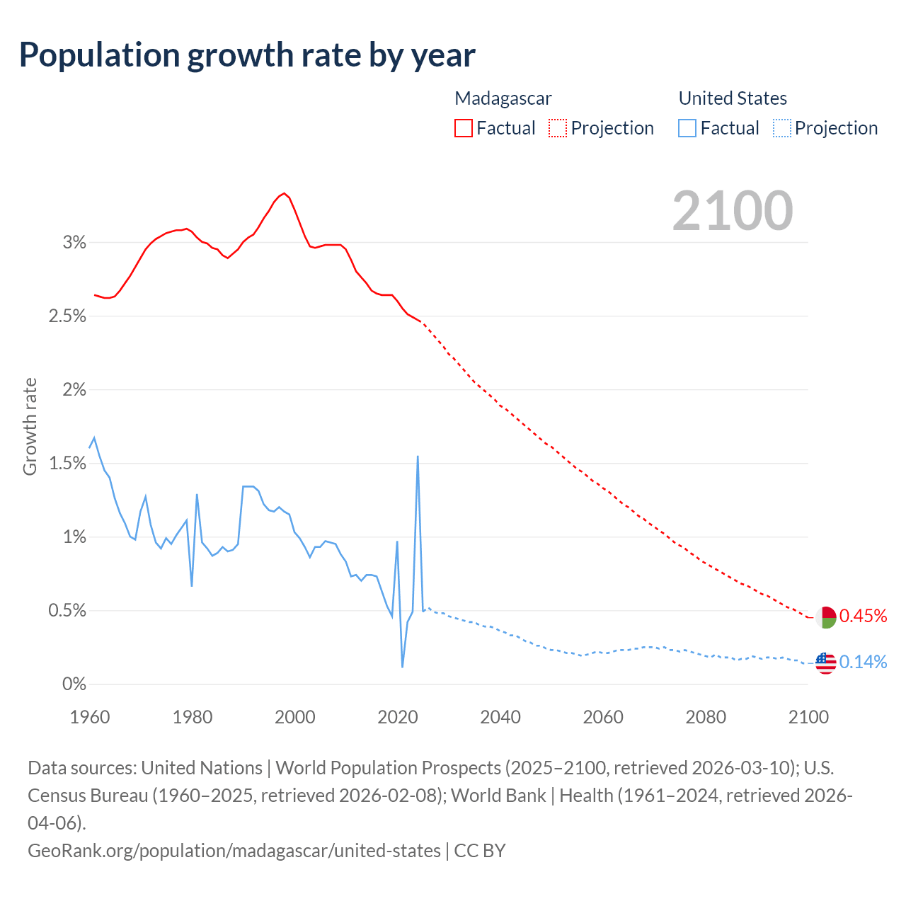 Data sources: World Bank | Health (1960–2024, retrieved 2026-04-06); United Nations | World Population Prospects (1960–2026, retrieved 2026-03-10); U.S. Census Bureau (1960–2025, retrieved 2026-02-08); Central Intelligence Agency (CIA) (2000–2019, retrieved 2026-02-20).