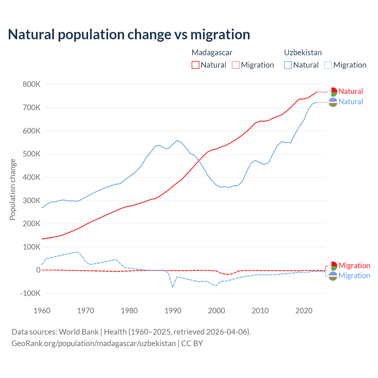 Over the last 10 years, 99.7% of the population change in Madagascar is from natural causes (a gain of 7,165,578 people) and 0.31% is from migration (a loss of 22,384 people). In Uzbekistan 98.2% is from natural causes (a gain of 6,161,117 people) and 1.84% is from migration (a loss of 115,398 people).