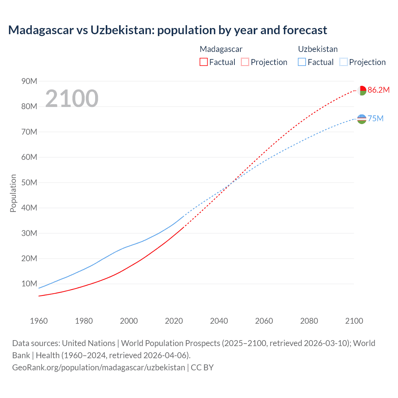 The latest officially reported population of Madagascar was 31,964,956 in 2024 vs 36,361,859 people in Uzbekistan in 2024. In 2026, based on the adjusted UN estimation, the current Madagascar's population is 33,750,171 people compared to 37,939,105 in Uzbekistan.