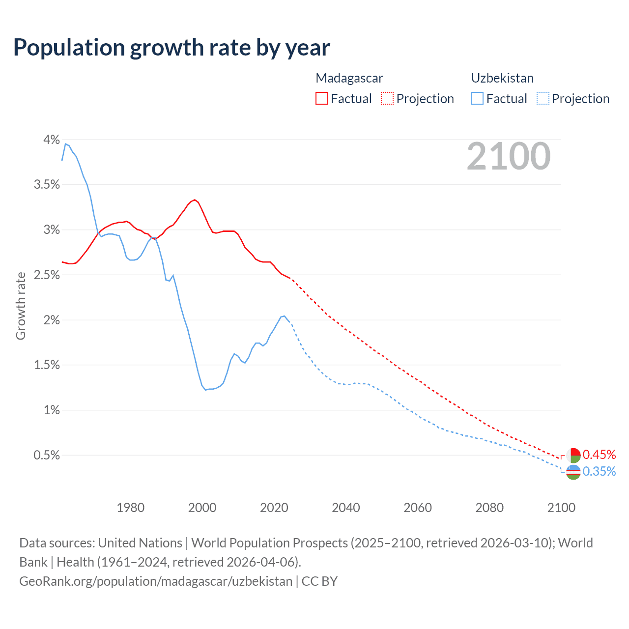 - For the last 10 years, Madagascar has had an average growth rate of +2.6% per year vs +1.85% in Uzbekistan.