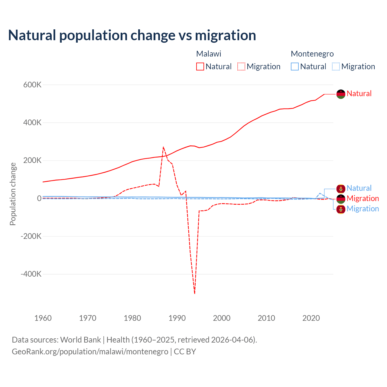 Over the last 10 years, 99.3% of the population change in Malawi is from natural causes (a gain of 5,019,393 people) and 0.67% is from migration (a loss of 33,768 people). In Montenegro 52.4% is from natural causes (a gain of 4,501 people) and 47.6% is from migration (a gain of 4,095 people).