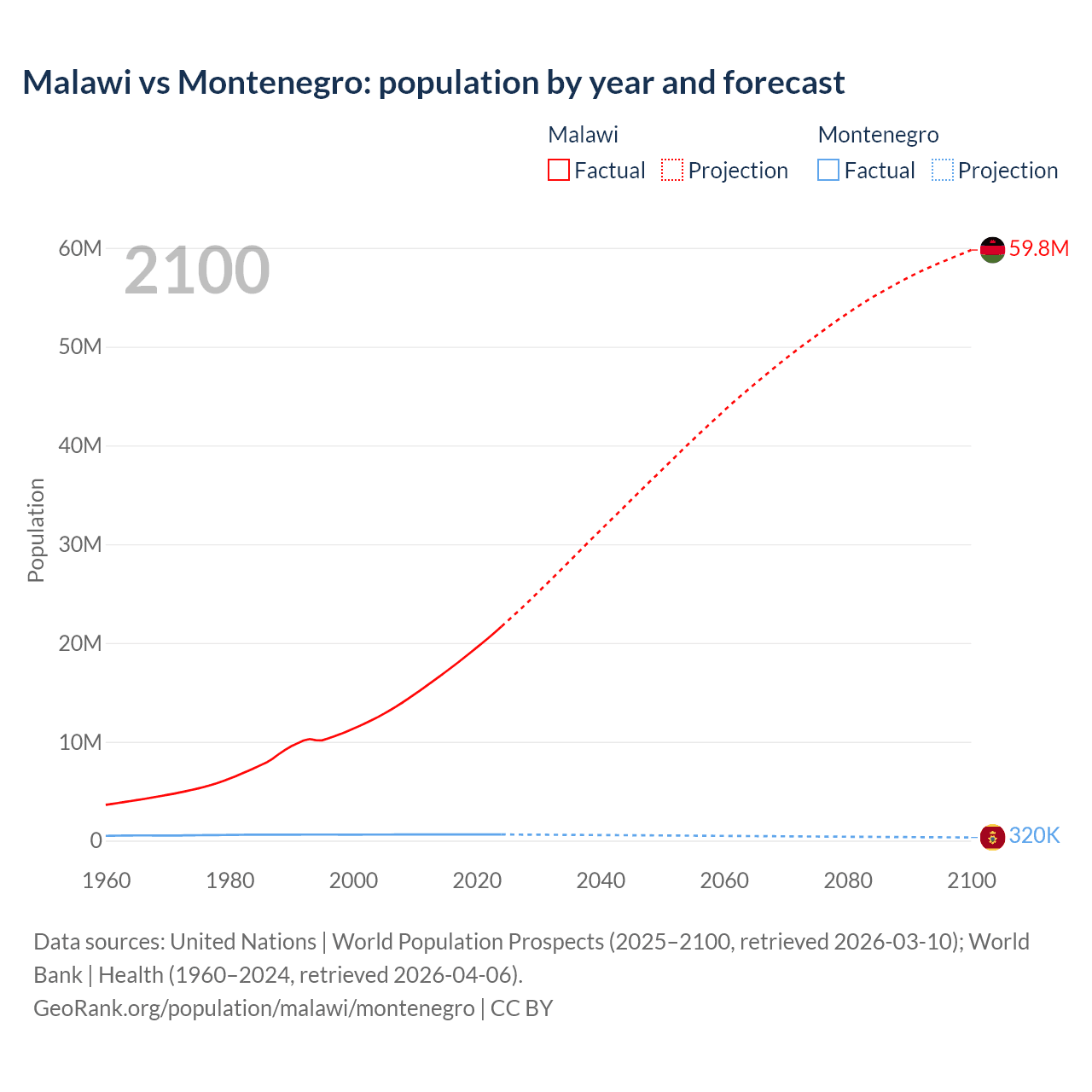 The latest officially reported population of Malawi was 21,655,286 in 2024 vs 623,525 people in Montenegro in 2024. In 2026, based on the adjusted UN estimation, the current Malawi's population is 22,949,294 people compared to 612,312 in Montenegro.