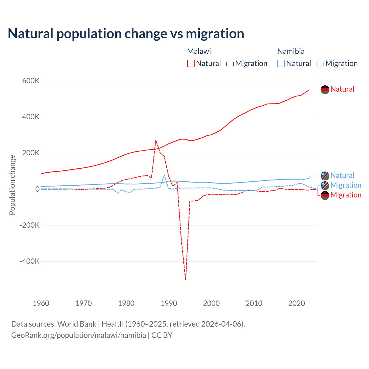Over the last 10 years, 99.3% of the population change in Malawi is from natural causes (a gain of 5,019,393 people) and 0.67% is from migration (a loss of 33,768 people). In Namibia 74.3% is from natural causes (a gain of 532,532 people) and 25.7% is from migration (a gain of 183,837 people).