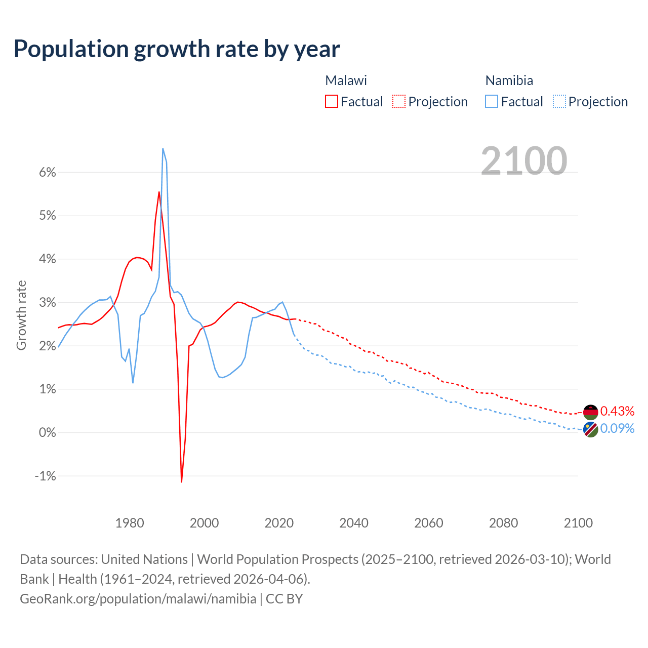 - For the last 10 years, Malawi has had an average growth rate of +2.7% per year vs +2.73% in Namibia.
