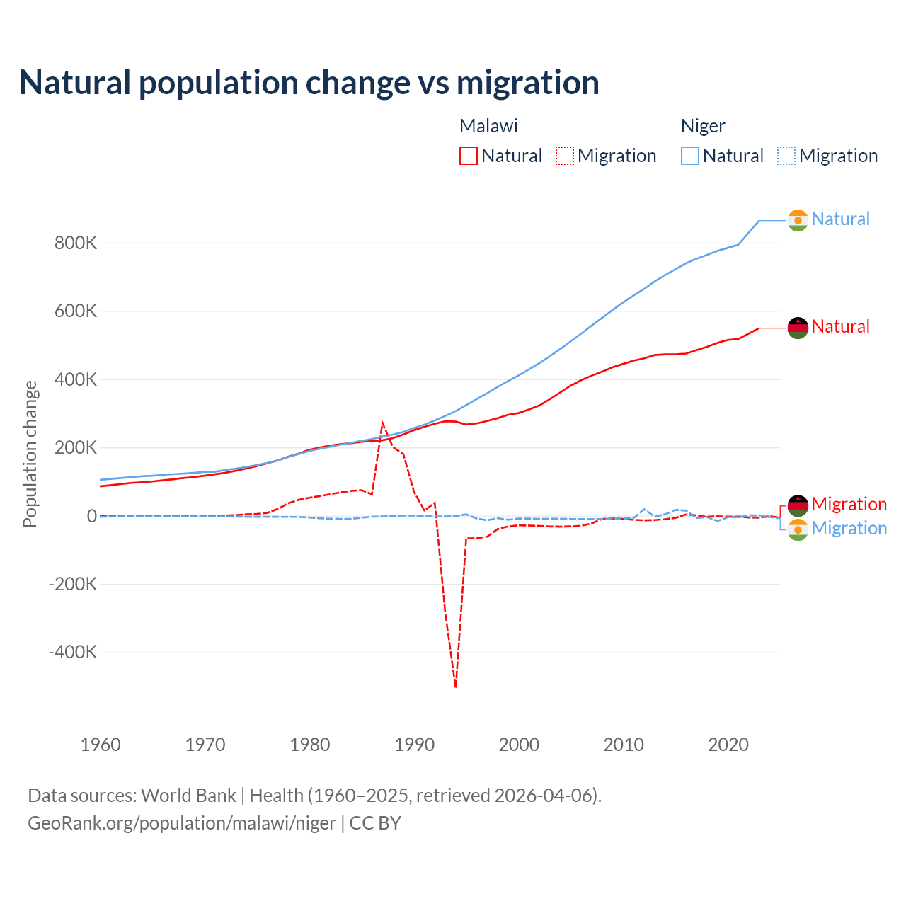 Over the last 10 years, 99.3% of the population change in Malawi is from natural causes (a gain of 5,019,393 people) and 0.67% is from migration (a loss of 33,768 people). In Niger 100% is from natural causes (a gain of 7,728,287 people) and 0.03% is from migration (a gain of 2,520 people).