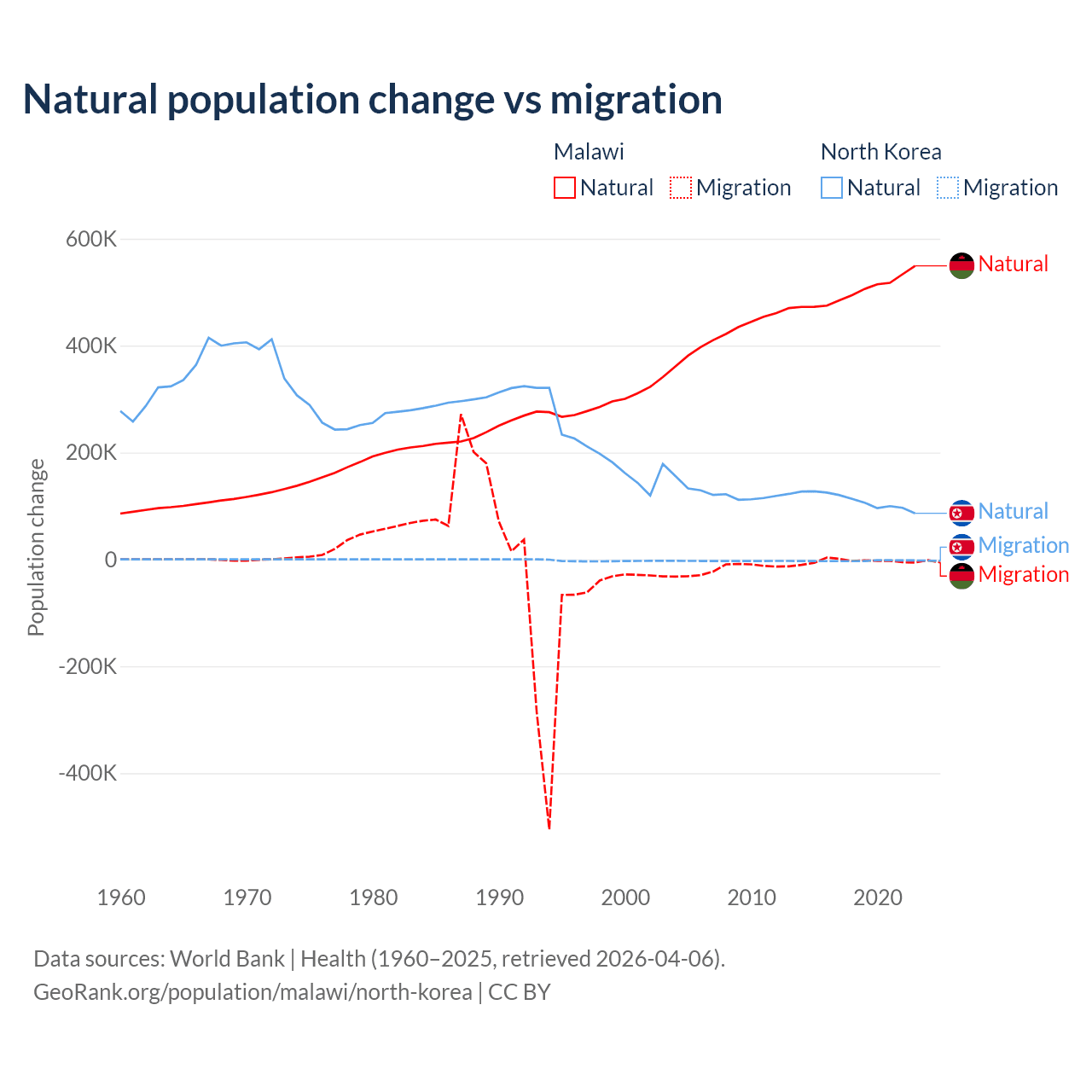 Over the last 10 years, 99.3% of the population change in Malawi is from natural causes (a gain of 5,019,393 people) and 0.67% is from migration (a loss of 33,768 people). In North Korea 97.7% is from natural causes (a gain of 1,097,372 people) and 2.33% is from migration (a loss of 26,227 people).