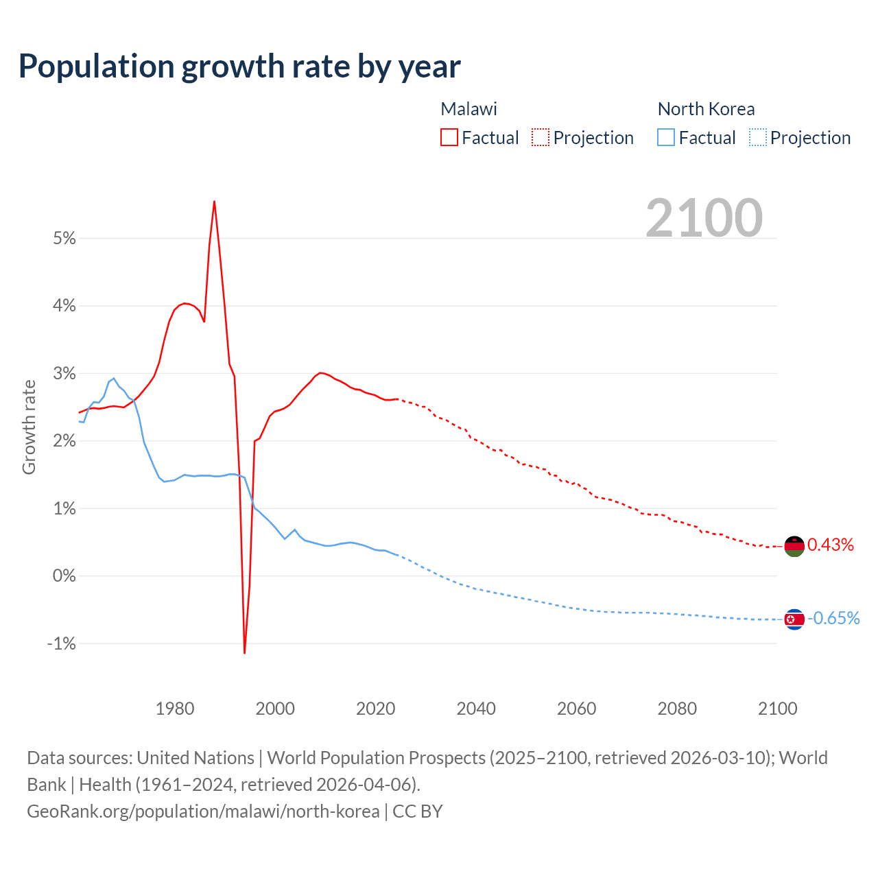 - For the last 10 years, Malawi has had an average growth rate of +2.7% per year vs +0.41% in North Korea.