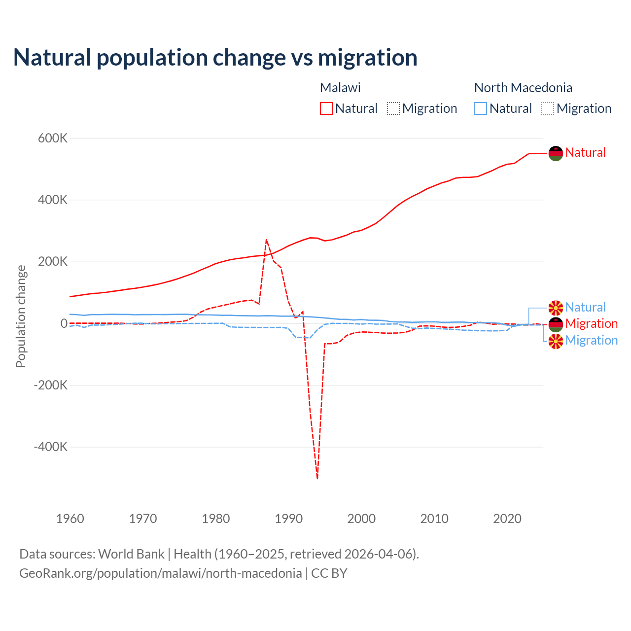 Over the last 10 years, 99.3% of the population change in Malawi is from natural causes (a gain of 5,019,393 people) and 0.67% is from migration (a loss of 33,768 people). In North Macedonia 6.45% is from natural causes (a loss of 12,585 people) and 93.5% is from migration (a loss of 182,429 people).