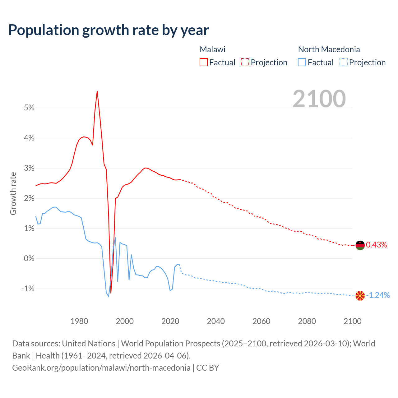 - For the last 10 years, Malawi has had an average growth rate of +2.7% per year vs -0.48% in North Macedonia.