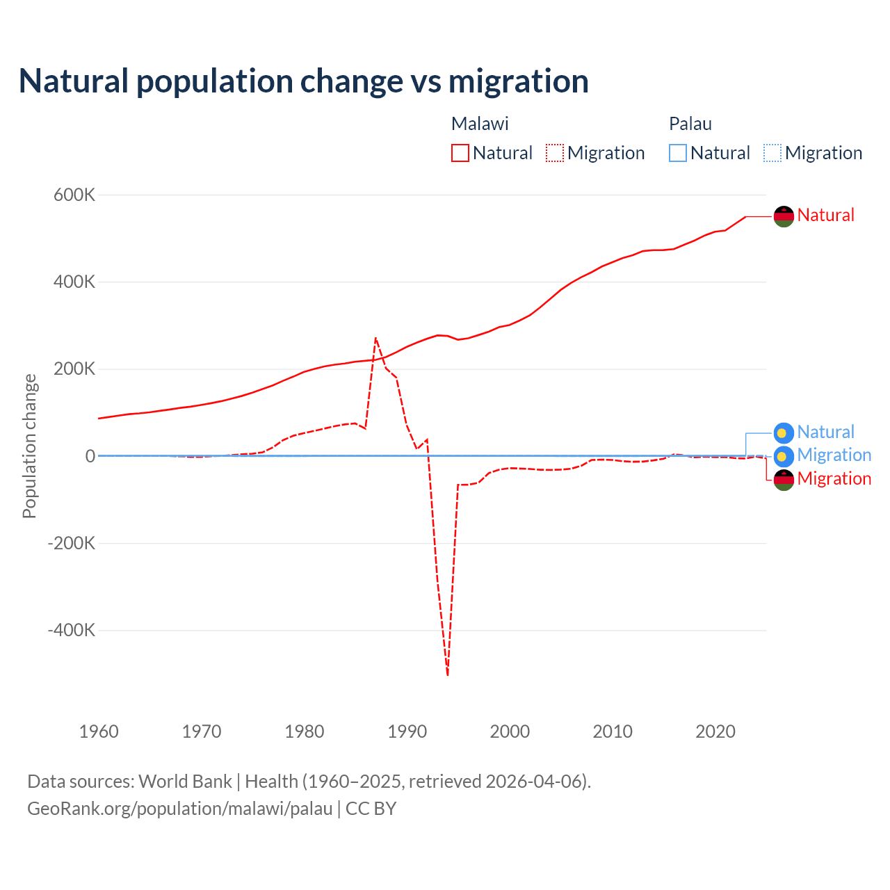 Over the last 10 years, 99.3% of the population change in Malawi is from natural causes (a gain of 5,019,393 people) and 0.67% is from migration (a loss of 33,768 people). In Palau 53.8% is from natural causes (a gain of 264 people) and 46.2% is from migration (a loss of 227 people).