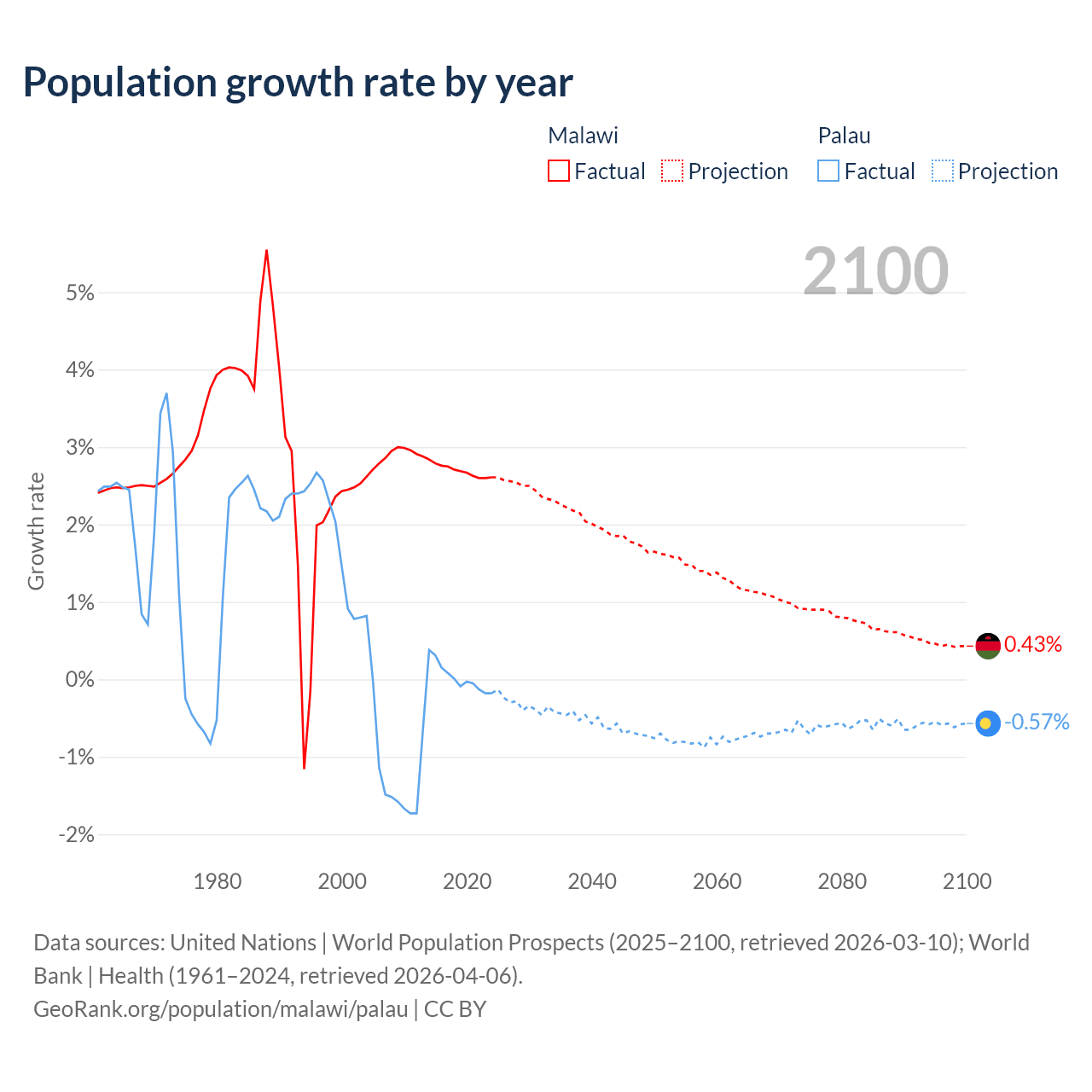 - For the last 10 years, Malawi has had an average growth rate of +2.7% per year vs +0.02% in Palau.