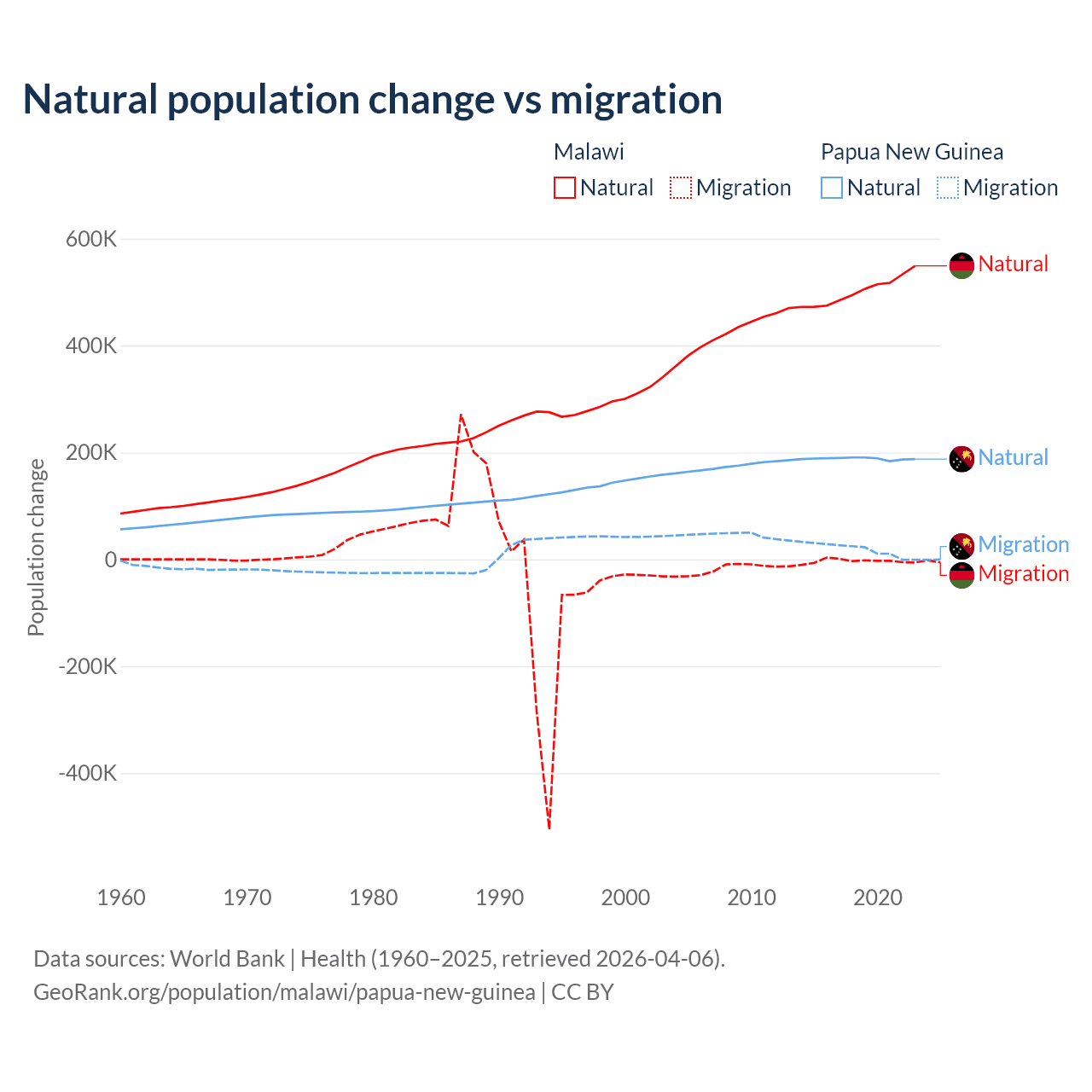 Over the last 10 years, 99.3% of the population change in Malawi is from natural causes (a gain of 5,019,393 people) and 0.67% is from migration (a loss of 33,768 people). In Papua New Guinea 91% is from natural causes (a gain of 1,883,906 people) and 8.98% is from migration (a gain of 185,900 people).