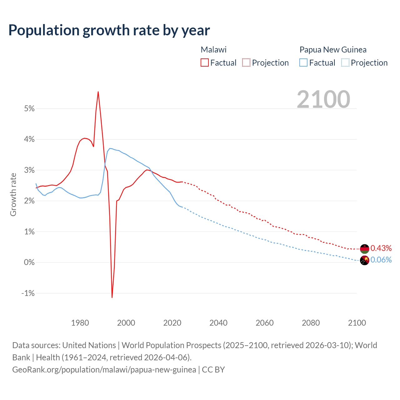 - For the last 10 years, Malawi has had an average growth rate of +2.7% per year vs +2.23% in Papua New Guinea.