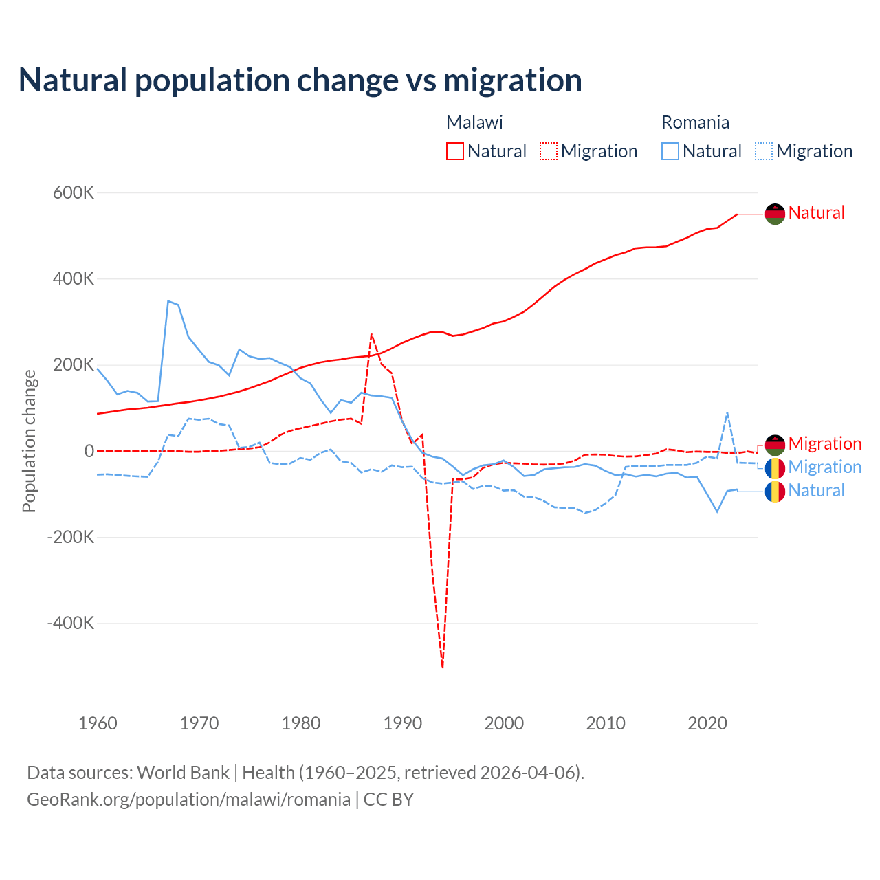 Over the last 10 years, 99.3% of the population change in Malawi is from natural causes (a gain of 5,019,393 people) and 0.67% is from migration (a loss of 33,768 people). In Romania 82% is from natural causes (a loss of 766,295 people) and 18% is from migration (a loss of 167,917 people).