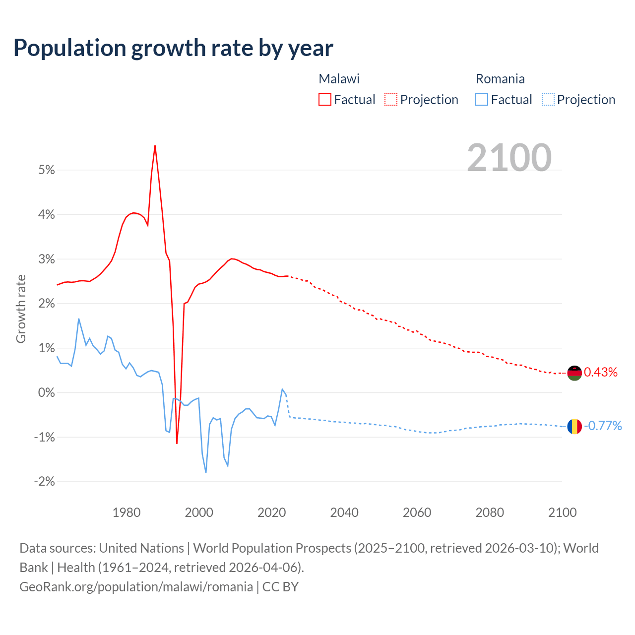 - For the last 10 years, Malawi has had an average growth rate of +2.7% per year vs -0.43% in Romania.