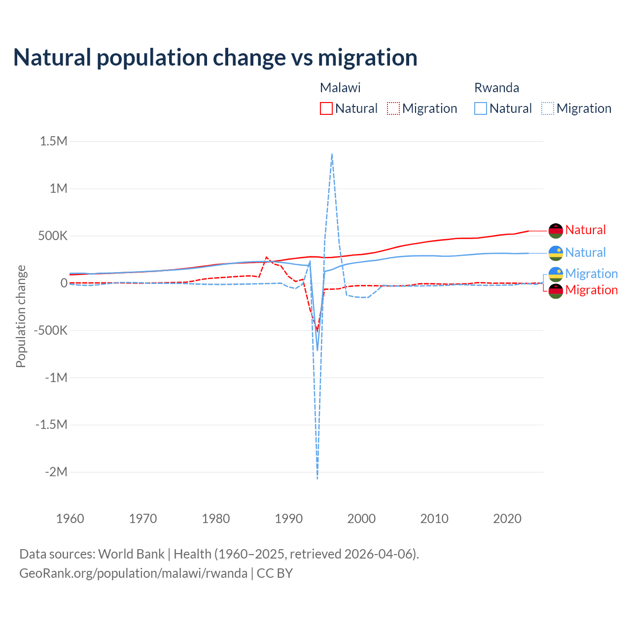 Over the last 10 years, 99.3% of the population change in Malawi is from natural causes (a gain of 5,019,393 people) and 0.67% is from migration (a loss of 33,768 people). In Rwanda 93.8% is from natural causes (a gain of 3,081,296 people) and 6.18% is from migration (a loss of 203,035 people).