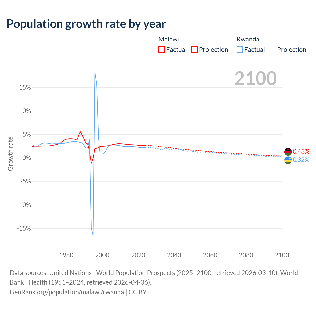 - For the last 10 years, Malawi has had an average growth rate of +2.7% per year vs +2.31% in Rwanda.