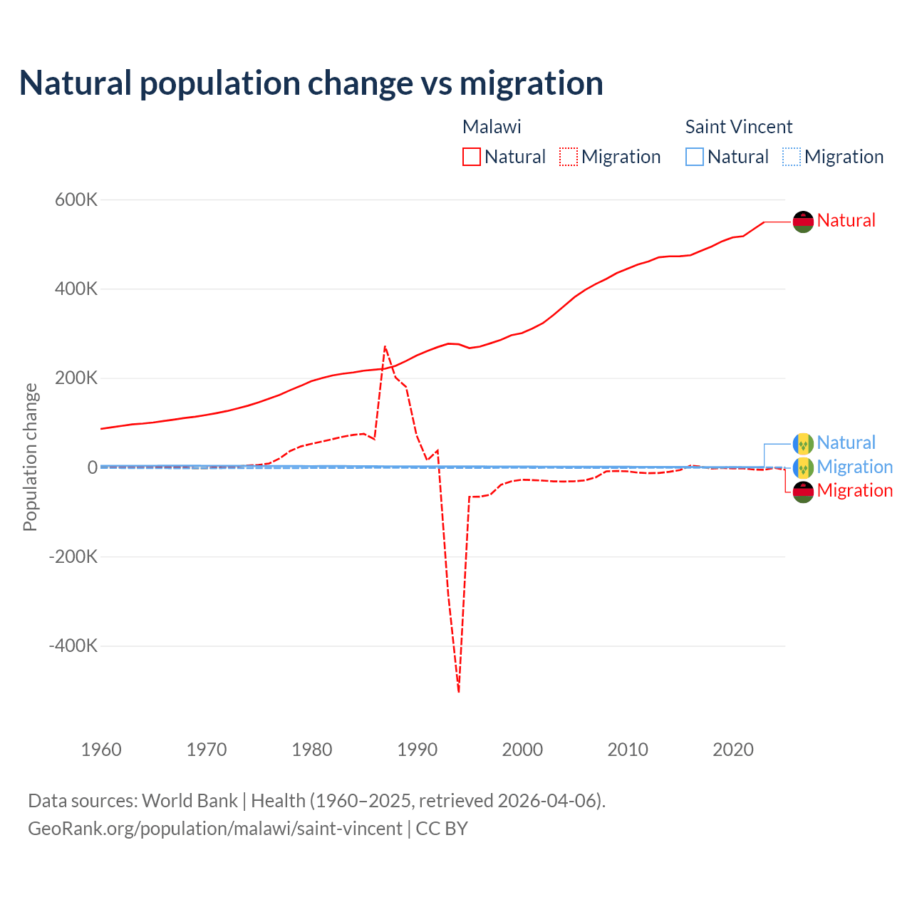 Over the last 10 years, 99.3% of the population change in Malawi is from natural causes (a gain of 5,019,393 people) and 0.67% is from migration (a loss of 33,768 people). In Saint Vincent 21.2% is from natural causes (a gain of 2,525 people) and 78.8% is from migration (a loss of 9,393 people).
