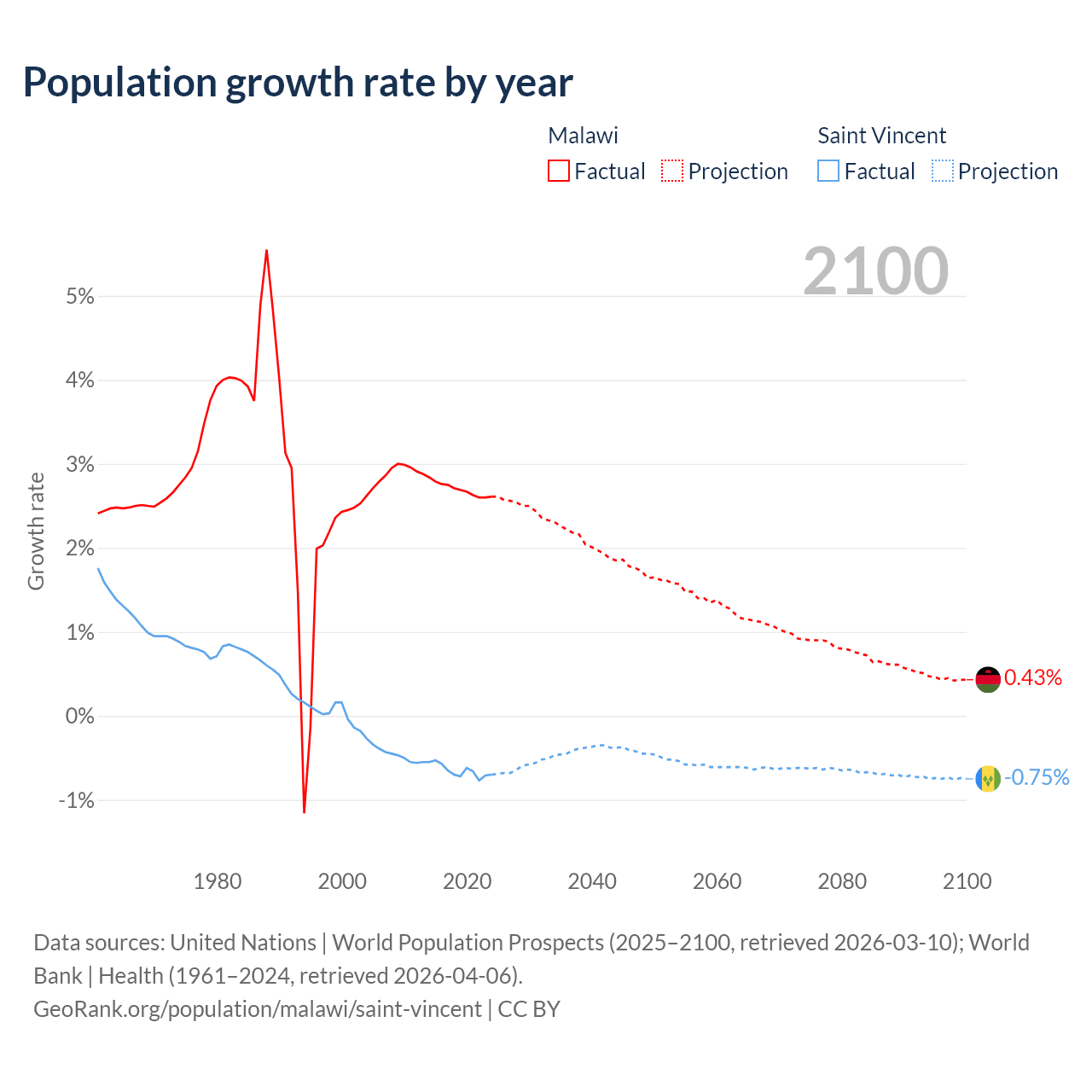 - For the last 10 years, Malawi has had an average growth rate of +2.7% per year vs -0.65% in Saint Vincent.