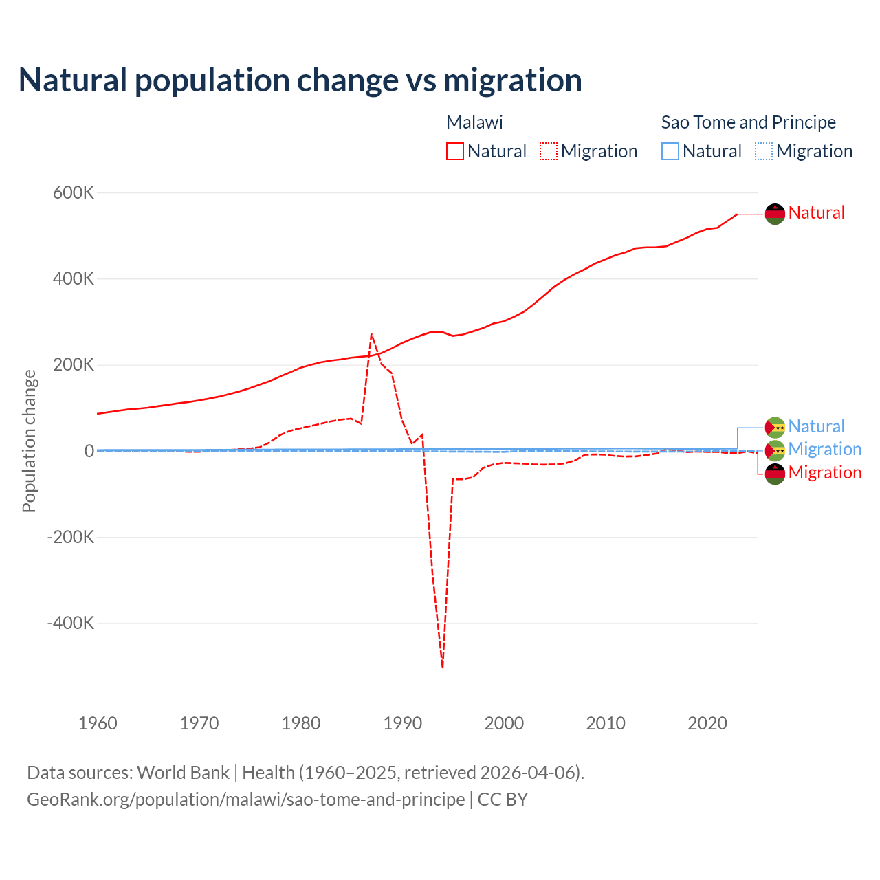 Over the last 10 years, 99.3% of the population change in Malawi is from natural causes (a gain of 5,019,393 people) and 0.67% is from migration (a loss of 33,768 people). In Sao Tome and Principe 80.1% is from natural causes (a gain of 50,822 people) and 19.9% is from migration (a loss of 12,621 people).