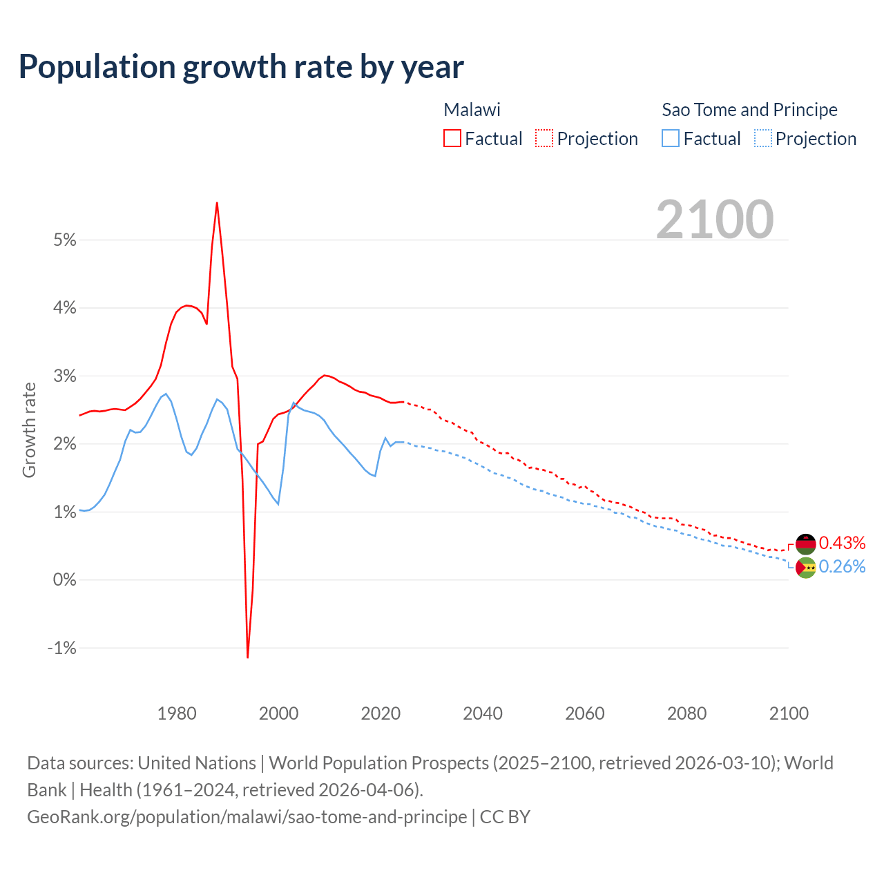 - For the last 10 years, Malawi has had an average growth rate of +2.7% per year vs +1.82% in Sao Tome and Principe.