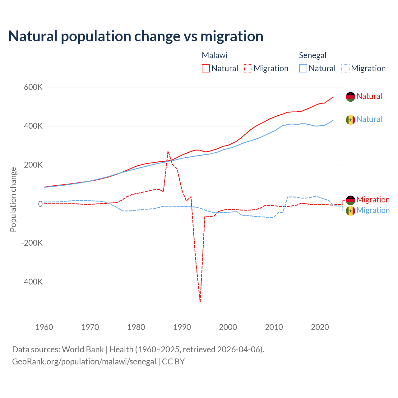 Over the last 10 years, 99.3% of the population change in Malawi is from natural causes (a gain of 5,019,393 people) and 0.67% is from migration (a loss of 33,768 people). In Senegal 93.9% is from natural causes (a gain of 4,089,205 people) and 6.13% is from migration (a gain of 267,266 people).
