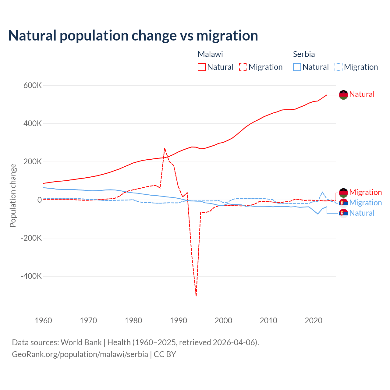 Over the last 10 years, 99.3% of the population change in Malawi is from natural causes (a gain of 5,019,393 people) and 0.67% is from migration (a loss of 33,768 people). In Serbia 83.3% is from natural causes (a loss of 435,148 people) and 16.7% is from migration (a loss of 87,110 people).