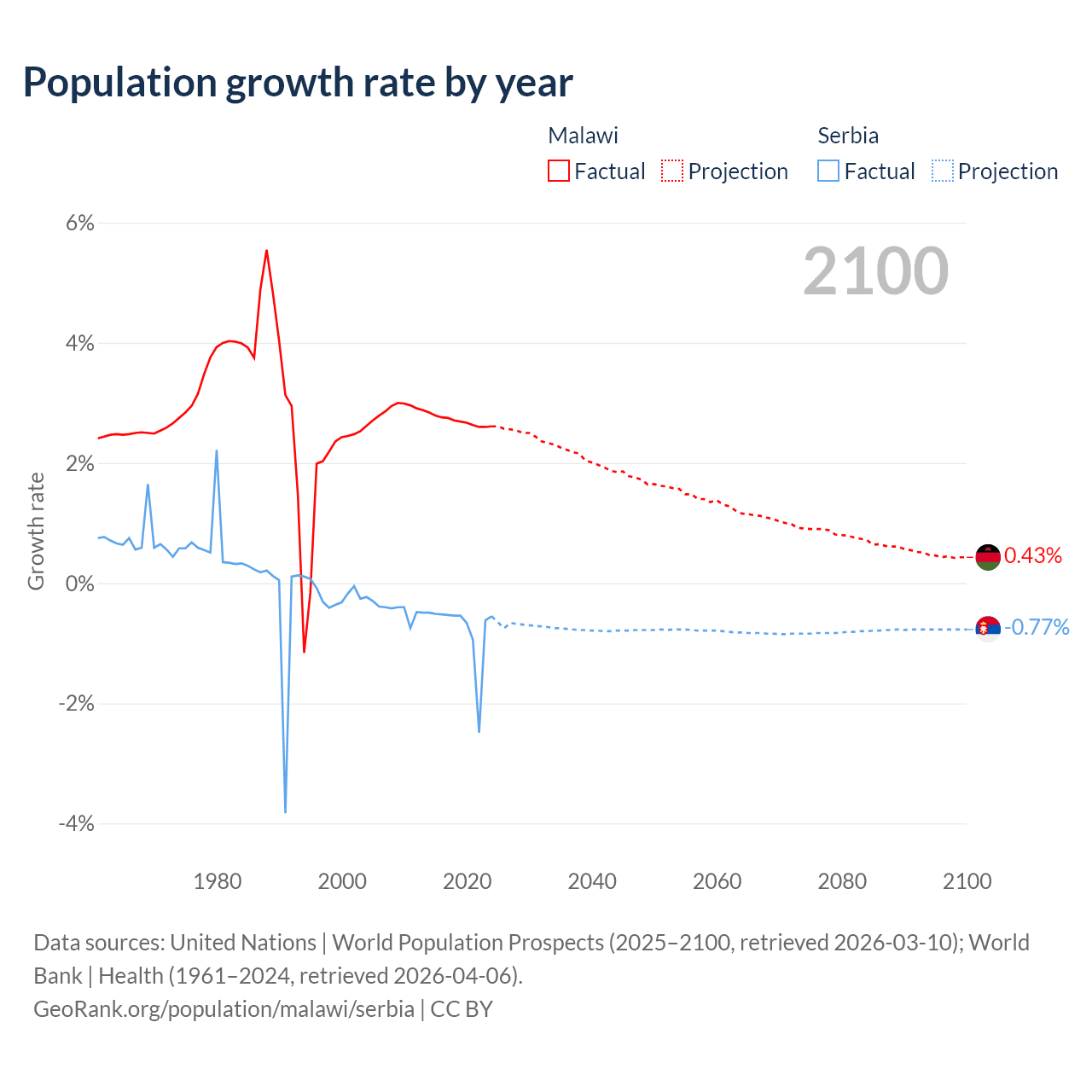 - For the last 10 years, Malawi has had an average growth rate of +2.7% per year vs -0.76% in Serbia.
