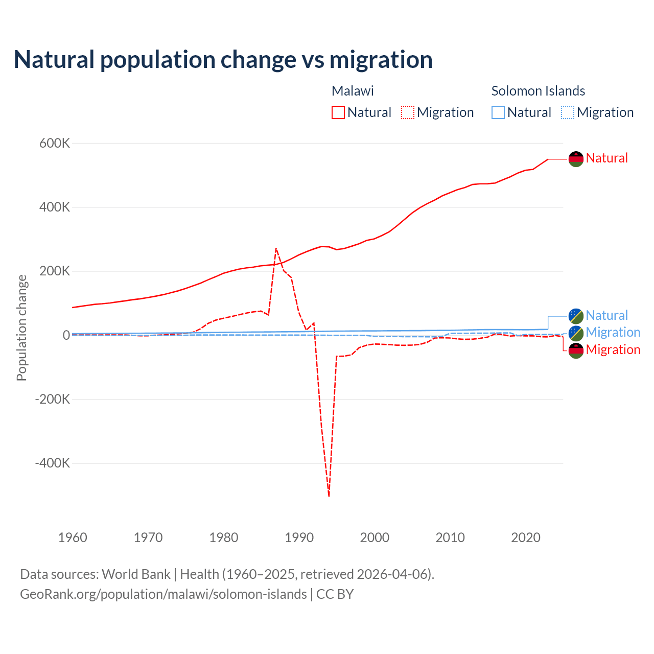 Over the last 10 years, 99.3% of the population change in Malawi is from natural causes (a gain of 5,019,393 people) and 0.67% is from migration (a loss of 33,768 people). In the Solomon Islands 82.8% is from natural causes (a gain of 168,727 people) and 17.2% is from migration (a gain of 35,031 people).